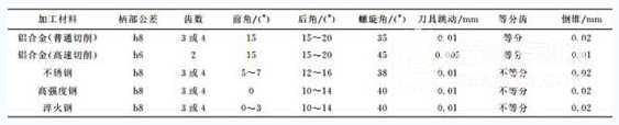 目前,高速切削鋁合金刀具多采用硬質合金刀具,粗加工刀具具有良好的強度及排屑性能,適用于大余量去除材料;精加工刀具具有良好的刃口鋒利性和較小的徑向力,適用于減少加工變形,降低表面粗糙度。刀具主要參數(shù)為前、后角和螺旋角,高速切削刀具與普通刀具幾何參數(shù)的區(qū)別主要為柄部公差、螺旋角和刀具跳動(見表1)。
