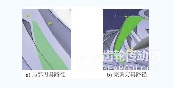 精加工中,流道底部按照3個區(qū)域分別拾取加工面,使用曲面等參數(shù)線加工策略,選擇插補軸的多軸方式,以區(qū)域邊界多個驅動軸為刀軸方向,通過手動設置適應 曲 率 變 化,形 成 整 齊、穩(wěn)定和高效的刀路。主葉片吸力面、主葉片壓力面、分流葉片吸力面和分流葉片壓力面分別采用同樣的策略,以無干涉、無跳刀和加工完整為目的,以區(qū)域邊界的25個驅動軸為刀軸方向,通過手動設置來適應劇烈的曲率變化,生成整齊可靠的刀路(見圖4)。