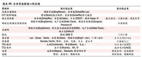 從產(chǎn)業(yè)鏈投資的角度來看,主要的變速箱零部件,如 DCT 的雙離合器模塊、AT 的液力變矩器、CVT 的鋼帶等核心零部件多由博格華納等國外巨頭所把控, 國產(chǎn)化尚需時日。部分變速箱齒輪、油泵供應(yīng)商等已進入國內(nèi)外自動變速箱 供應(yīng)鏈,未來有望大幅受益。