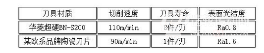 和陶瓷刀具相比較的效果如下:在切削速度高于陶瓷刀具12%的基礎上,刀具壽命是陶瓷刀具的8倍,而且表面光潔度達到Ra0.8。