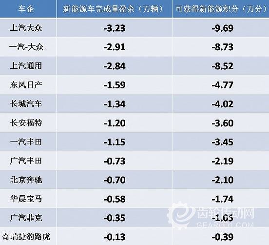 部分車企積分排名:大眾新能源積分缺口最嚴重
