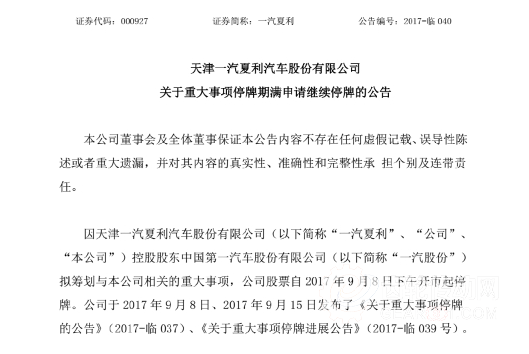 而此前,一汽夏利于9月8日開始公告停牌,停牌原因是“一汽股份正在籌劃涉及公司的重大事項。”