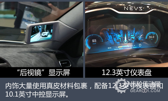 NEVS 9-3內飾配有多功能方向盤,并裝配12.3英寸全液晶儀表盤和10.1英寸中控大屏,提供車載WIFI,無線軟件更新,智能手機電池管理系統等,科技感十足。車內運用大量真皮材料包裹,包括接觸區域打孔設計的座椅、檔把以及方向盤等。另外車內空氣凈化系統,30秒內就能將PM2.5從800ppm凈化至25ppm以下,提升了新車整體的舒適感。