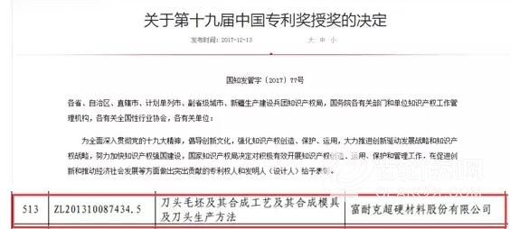 近日,國(guó)家知識(shí)產(chǎn)權(quán)局公示了第十九屆中國(guó)專利獎(jiǎng)獲獎(jiǎng)項(xiàng)目,富耐克自主研發(fā)的“刀頭毛坯及其合成工藝及其合成模具及刀頭生產(chǎn)方法專利榮獲"中國(guó)專利獎(jiǎng)優(yōu)秀獎(jiǎng)"。