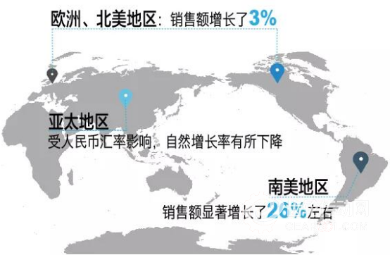 采埃孚在全世界各個地區的銷售額增長不盡相同。在歐洲和北美市場,銷售額增長了3%。而在亞太市場,由于中國人民幣的匯率影響,自然增長率從8%減少至約2%。在集團財報中同時也顯示,南美市場的金融危機在很大程度上已被克服。在這一區域的銷售額已從之前的較低水平大幅增長了約26%。