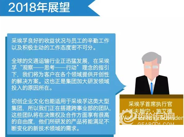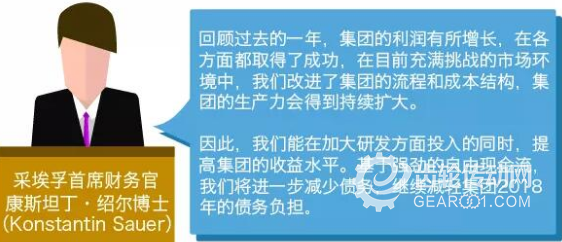 2018年2月1日上任的采埃孚(ZF)首席執行官沃夫翰寧·施艾德(Wolf-Henning Scheider)先生在于3月22日在腓德烈斯哈芬介紹集團年度財務情況時宣布:采埃孚股份公司(ZF Friedrichshafen AG)將會進一步加大在研發領域的投入,同時,集團也將加快在未來交通運輸領域技術的輸出。集團2017財年銷售額達到創紀錄的364億歐元,去除匯率以及并購因素影響,自然增長率達到6%。集團收購天合的債務也進一步減少;盡管研發開支有所增長,調整后的息稅前利潤(EBIT)仍達23億歐元。