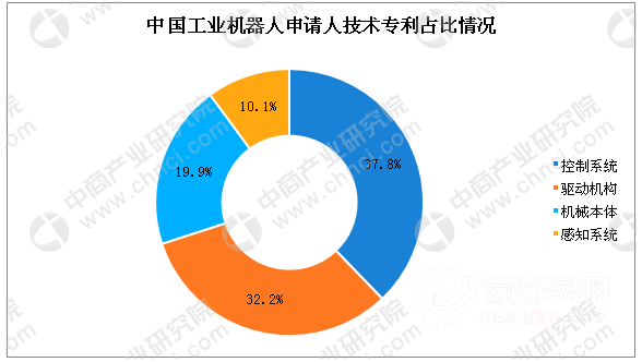 控制系統作為工業機器人的核心系統,對于不同類型的機器人,控制系統也存在較大的差別,對機器人的性能起到關鍵性作用,在一定程度上影響機器人的發展,數據顯示,中國工業機器人申請人技術占比占比最高的是控制系統,占比為38%;其次為驅動機構,占比為32%;排名第三的是機械本體,占比為20%,其后為感知系統,占比為10%,由此可見,控制系統是發明專利的主體,是專利申請人重點關注的領域。