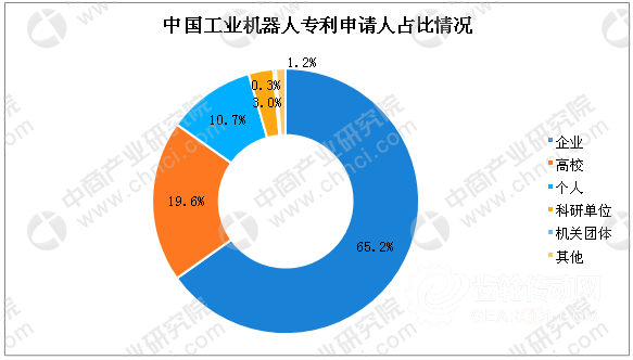 數據顯示,截止2017年7月,中國工業機器人領域的專利/申請累計已達95247件,其中企業專利申請人占比為65%,高校申請人占比為19.8%,個人申請人占比為10.8%,科研占比為3.0%,機關團體占比為0.3%。