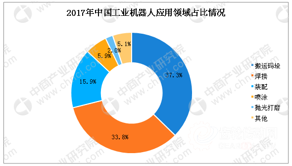 在應用領域方面,搬運碼垛占比為37%,焊接占比為34%,其后分別為裝配、噴涂以及拋光打磨領域,占比分布為16%、6%以及2%。