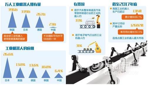 然而,我國工業(yè)機器人的使用密度遠低于全球平均水平,與韓國、日本、德國等發(fā)達國家相比差距更加明顯。如韓國是全球工業(yè)機器人使用密度最高的國家,每萬人中擁有機器人數(shù)量396臺;日本的萬人擁有量也達到了339臺;德國則以267臺的萬人擁有量位居第三。而我國的萬人工業(yè)機器人擁有量則僅為23臺,不及國際平均水平58臺的一半。目前工業(yè)機器人的應用在我國比例為6.4%,日本是26.6%、美國是13.8%、德國是13.6%、韓國是10.8%。由此來看,與發(fā)達國家的巨大差距意味著我國工業(yè)機器人市場發(fā)展?jié)摿薮蟆?br />