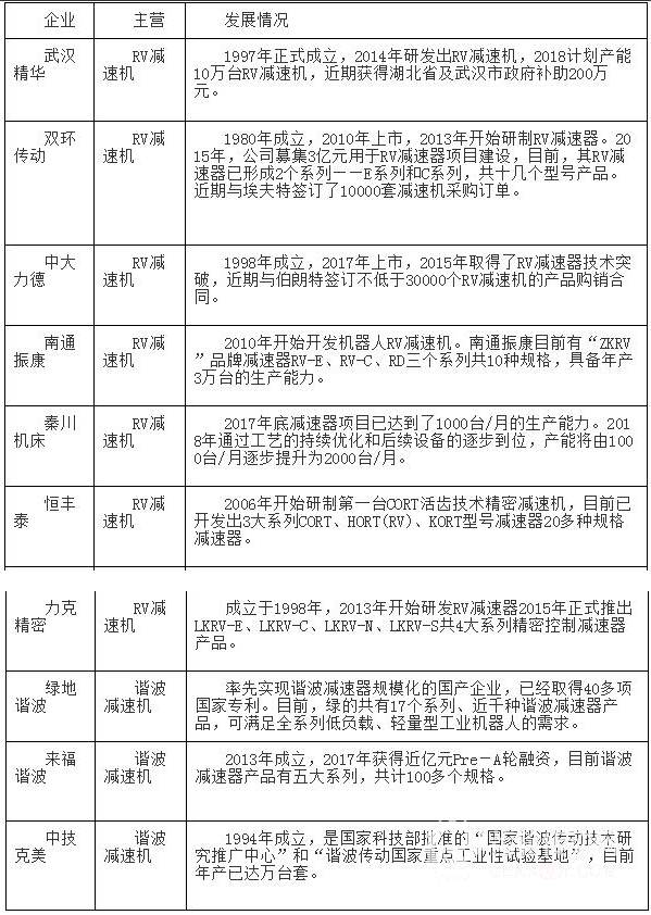 可以看出,目前國(guó)內(nèi)主要的減速機(jī)企業(yè)成立時(shí)間都不短,都有一定的歷史積累,但減速機(jī)技術(shù)上取得突破都在近幾年,一方面是技術(shù)要求比較高,需要一定的技術(shù)積累,另一方面則是由于近年來(lái)國(guó)內(nèi)工業(yè)機(jī)器人整體市場(chǎng)的發(fā)展讓企業(yè)看到了減速機(jī)發(fā)展前景,也加了大了投入力度。