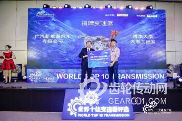 廣汽新能源汽車有限公司黨委書記、紀(jì)委書記、工會(huì)主席黃河(左一)向清華大學(xué)汽車工程系捐贈(zèng)獲獎(jiǎng)變速器