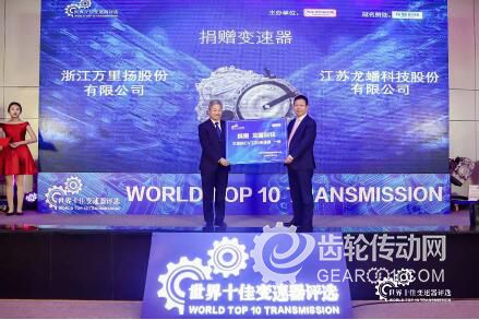 江蘇龍?bào)纯萍脊煞萦邢薰径麻L石俊峰(右一)代表龍?bào)纯萍冀邮苷憬f里揚(yáng)股份有限公司執(zhí)行總裁張志東捐贈(zèng)獲獎(jiǎng)變速器