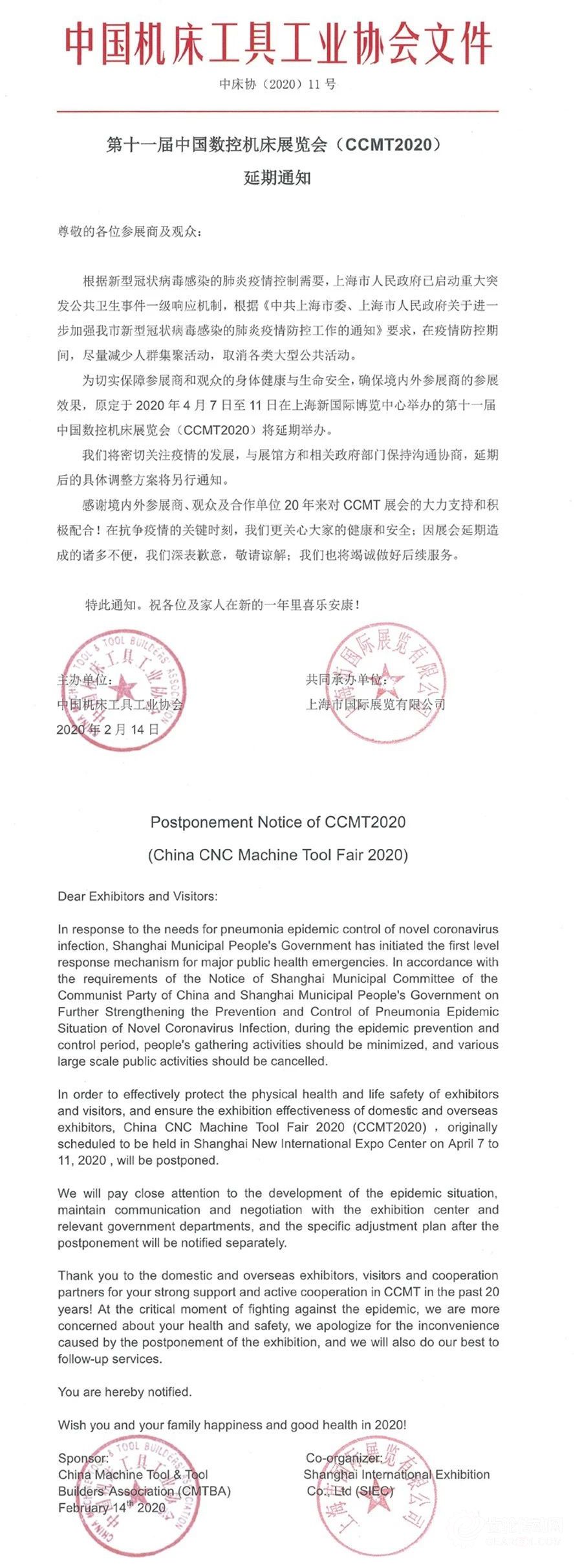 CCMT2020第十一屆中國數控機床展覽會延期通知