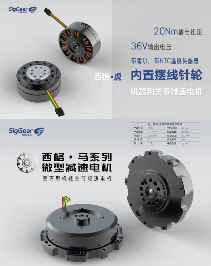 如今,西格產品有兩大類:標品系列和定制系列。其中,標品系列細分為微型行星齒輪箱、擺線針輪減速箱、并推出了全新扁平化關節電機品牌,西格•馬及西格•虎。