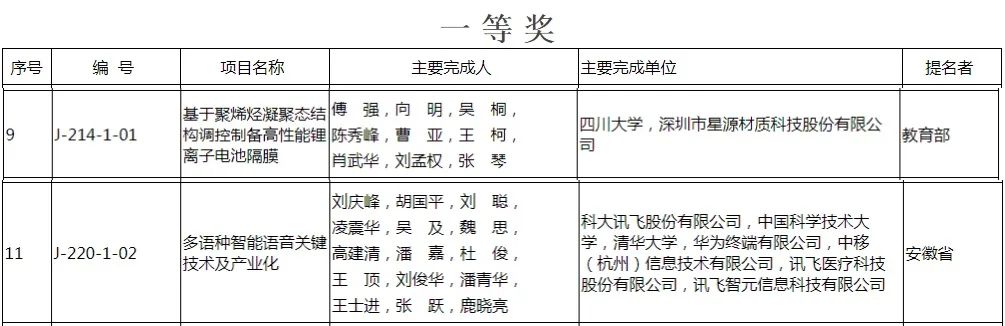 此外,四川大學、深圳市星源材質科技股份有限公司共同完成的《基于聚烯烴凝聚態結構調控制備高性能鋰離子電池隔膜》,科大訊飛作為第一完成單位的《多語種智能語音關鍵技術及產業化》項目獲得2023年度國家科學技術進步獎一等獎。