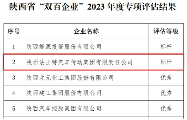 近日,國務院國資委公布地方“雙百企業”2023年度專項評估結果,法士特集團再次獲評“雙百企業”標桿企業。至此,法士特已連續兩年蟬聯國務院國資委“雙百企業”最高評級榮譽。