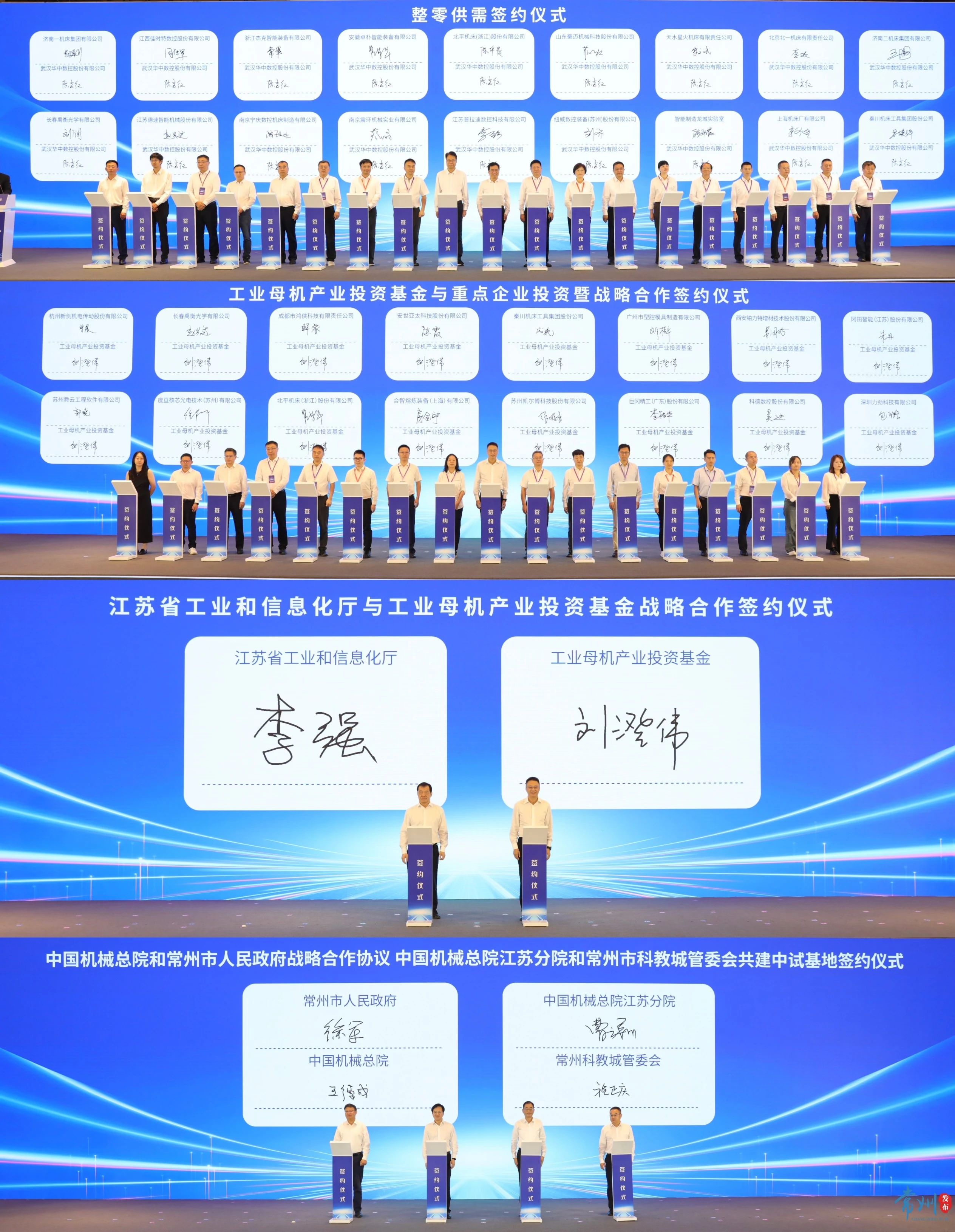 在簽約環節,舉行了華中數控與工業母機企業整零集中簽約,工業母機產業投資基金與重點企業投資暨戰略合作簽約,江蘇省工業和信息化廳與工業母機產業投資基金合作簽約,以及中國機械總院與常州市人民政府戰略合作、中國機械總院江蘇分院與常州市科教城共建中試基地簽約等。