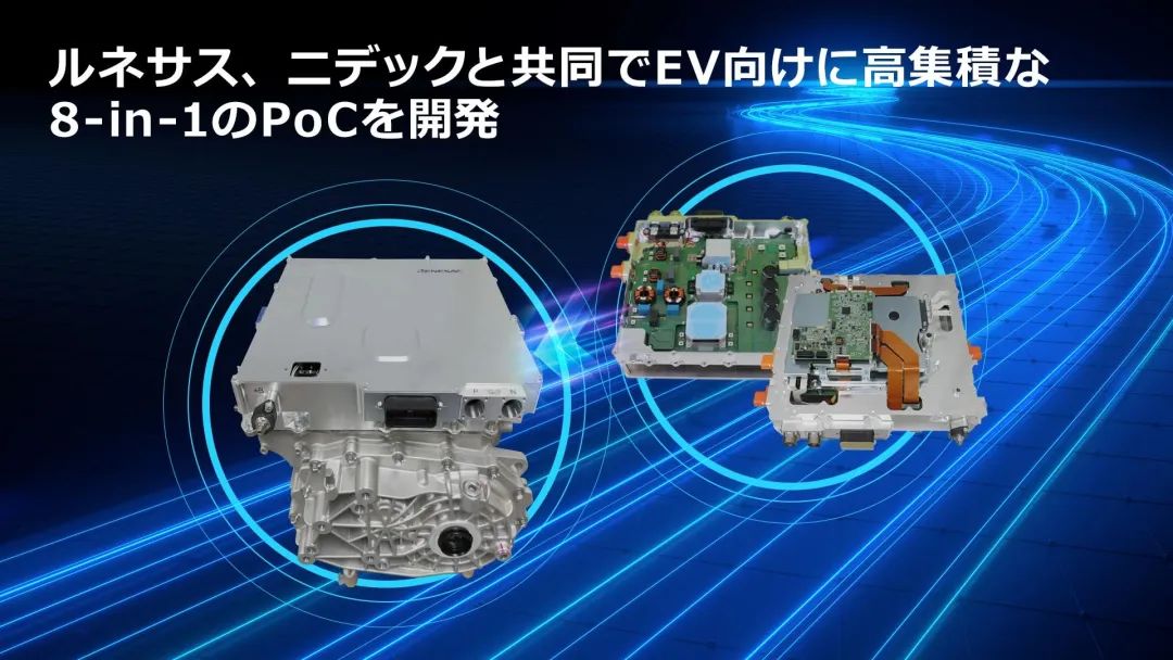 據了解,該系統運用“8合1”概念驗證(PoC),即可通過單個MCU控制8個功能。該PoC與尼得科合作開發,集成電機、齒輪(減速機)、逆變器、DC/DC轉換器和車載電池充電器(OBC)。據悉,現已完成系統級測試。