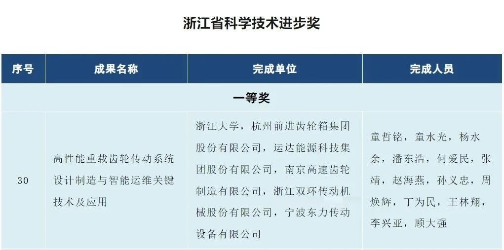 11月22日,加快建設創新浙江因地制宜發展新質生產力動員部署會暨全省科學技術獎勵大會在杭州舉行。大會表彰了2023年度浙江省科學技術獎310項。其中,浙江科技大獎1項,自然科學獎、技術發明獎、科學技術進步獎共299項,國際科學技術合作獎10項。由浙江大學,杭州前進齒輪箱集團股份有限公司,運達能源科技集團股份有限公司,南京高速齒輪制造有限公司,浙江雙環傳動機械股份有限公司,寧波東力傳動設備有限公司聯合完成的《高性能重載齒輪傳動系統設計制造與智能運維關鍵技術及應用》項目榮獲“浙江省科學技術進步獎”一等獎。