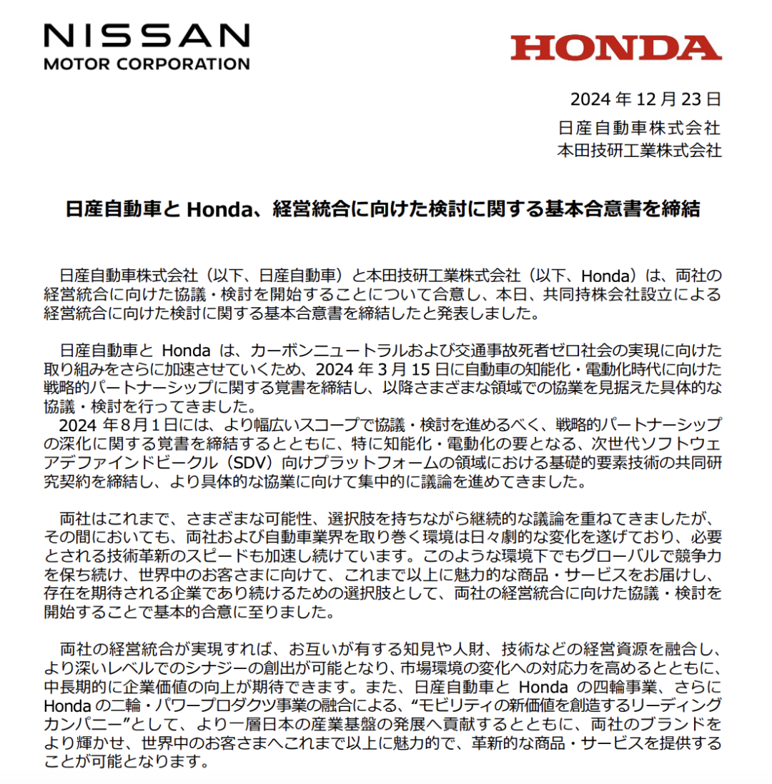 據(jù)了解,本田汽車和日產汽車計劃共同出資成立控股公司,雙方均作為該控股公司子公司的方式進行合并,合并后可實現(xiàn)整體年銷售額超30萬億日元、年營業(yè)利潤超3萬億日元的目標。文件顯示,控股公司董事會超半數(shù)成員將由本田提名,其中控股公司將由本田持股過半,控股公司計劃2026年8月上市,本田和日產將隨之退市。與此同時,作為日產汽車子公司,三菱汽車也將考慮加入合并的可能性。
