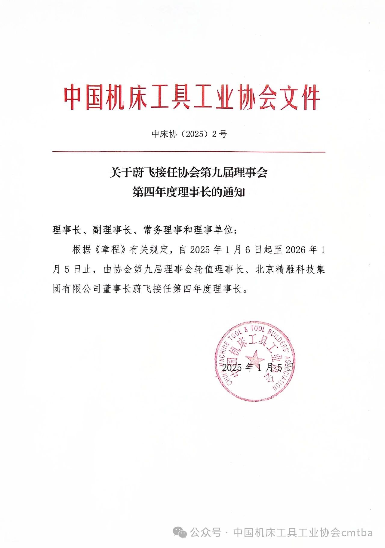 ?  北京精雕科技集團有限公司董事長蔚飛接任中國機床工具工業(yè)協(xié)會第九屆理事會第四年度理事長。