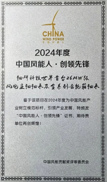 2025年1月11日,由中國可再生能源學會風能專業委員會主辦的“2025中國風能新春茶話會”在北京隆重舉行,洛陽軸研科技有限公司研發的“世界首臺26MW級風電主軸軸承及全系列齒輪箱軸承”榮獲2024年度“中國風能人·創領先鋒獎”,研發工程師莊智強榮獲“中國風能人·青年先鋒”稱號。