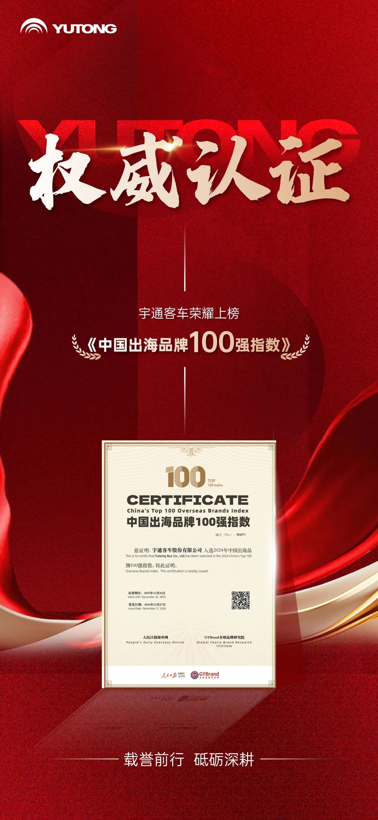 近日,由人民日報和GYBrand全球品牌研究院聯合編制發布的《中國出海品牌100強指數》榜單出爐,宇通客車成為客車領域唯一獲此殊榮的企業。