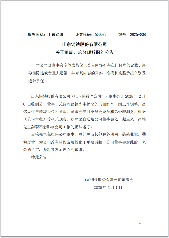 2月6日晚間,山東鋼鐵股份有限公司發布公告稱,公司董事會于當日收到公司董事、總經理呂銘提交的書面辭呈。因工作調整,呂銘申請辭去公司董事、董事會專門委員會委員及總經理職務。