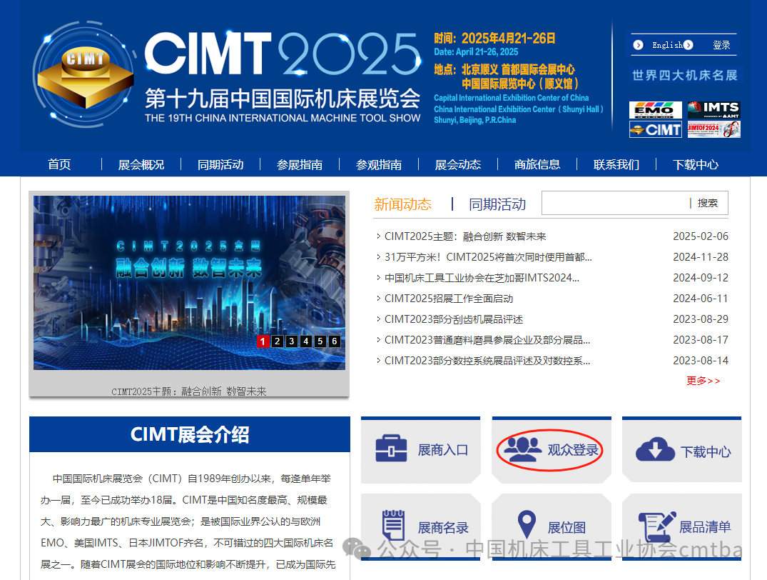 第十九屆中國國際機床展覽會(CIMT2025)觀眾入場證線上登錄系統已開放,境內外觀眾均可登錄該系統自行注冊辦理“觀眾入場證”。