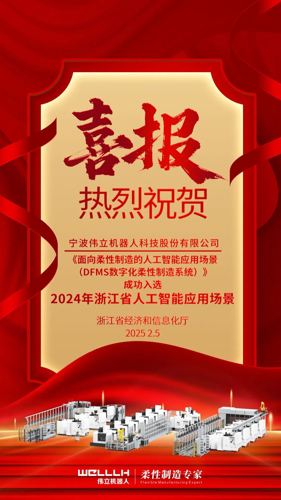 偉立機器人自主研發的《面向柔性制造的人工智能應用場景(DFMS數字化柔性制造系統)》憑借其技術創新與場景應用價值,成功入選2024年浙江省人工智能應用場景名單。