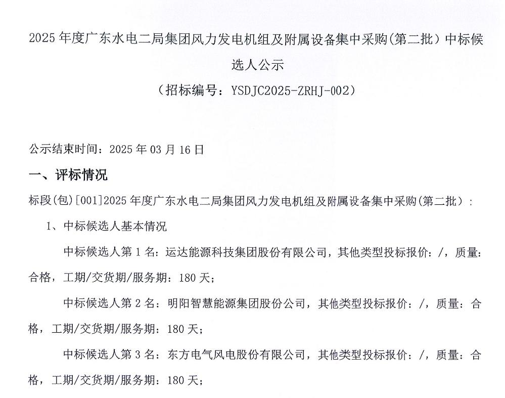 中國(guó)風(fēng)電新聞網(wǎng)訊:3月13日,2025年度廣東水電二局集團(tuán)風(fēng)力發(fā)電機(jī)組及附屬設(shè)備集中采購(gòu)(第二批)中標(biāo)候選人公示 ,規(guī)模共計(jì)500MW,運(yùn)達(dá)股份預(yù)中標(biāo)。