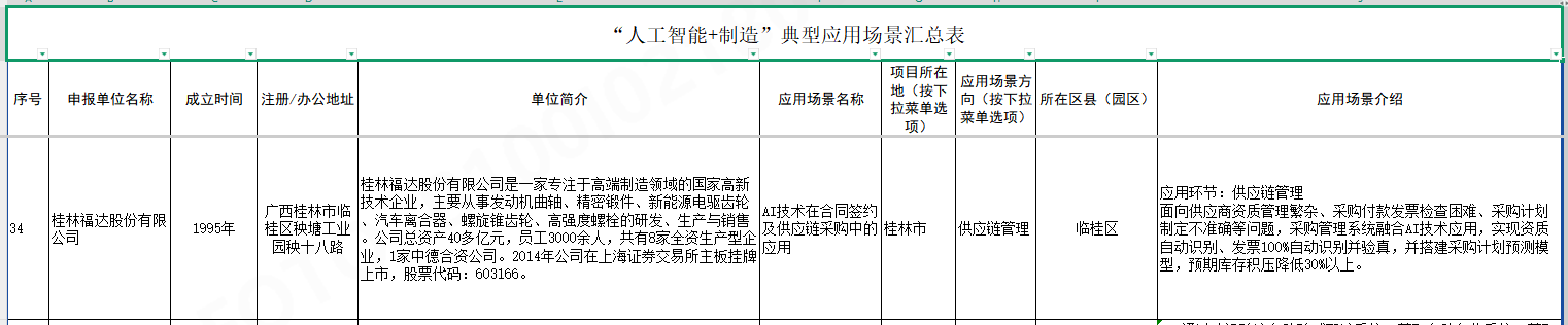 近日,桂林福達股份有限公司向自治區工業和信息化廳申報 “AI 技術在合同簽約及供應鏈采購中的應用” 場景,成功入選 “2025 年第一批廣西人工智能產品、垂直領域模型和‘人工智能 + 制造’典型應用場景名單”。