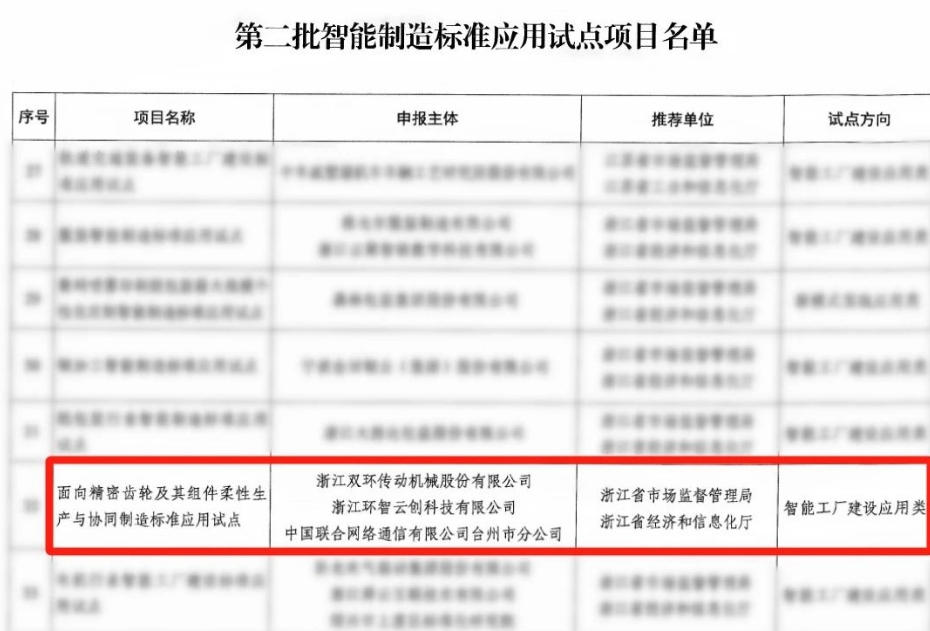 近日,國家標準化管理委員會與工業和信息化部聯合發布了《第二批智能制造標準應用試點項目名單》,雙環傳動及其子公司環智云創聯合中國聯通臺州分公司申報的項目《面向精密齒輪及其組件柔性生產與協同制造標準應用試點》成功上榜。這標志著雙環及其子公司環智云創在智能制造領域的創新能力與技術實力獲得高度認可。