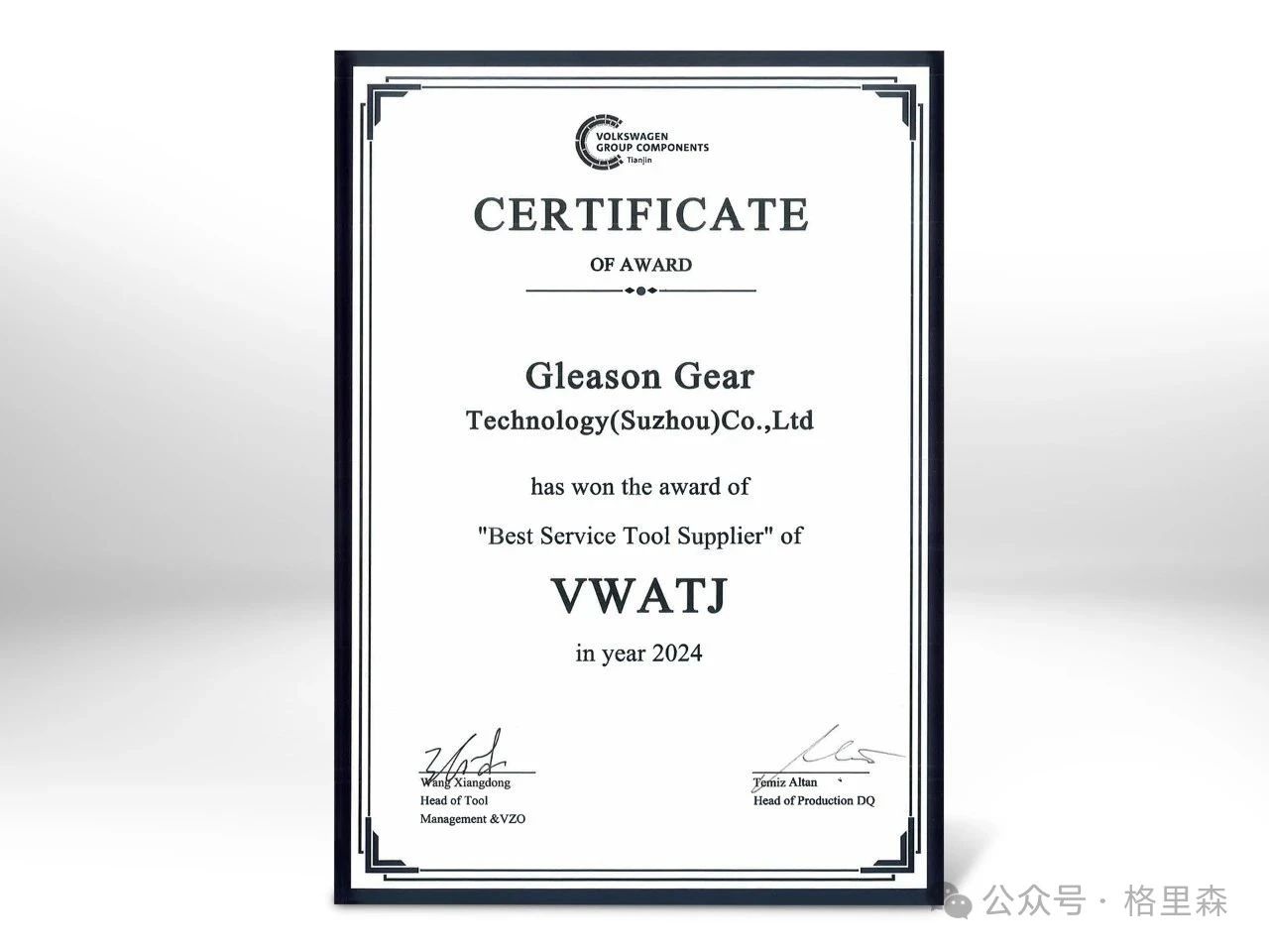 感謝大眾自動變速器(天津)將 2024 年度最佳刀具供應商獎授予格里森刀具蘇州工廠!格里森刀具憑借卓越的質量、通過本地化刀具修磨實現的顯著成本節約,以及在樣品刀具方面極快的交付支持獲此殊榮!大眾與格里森攜手將愿景變為現實 —— 我們將繼續相互激勵。