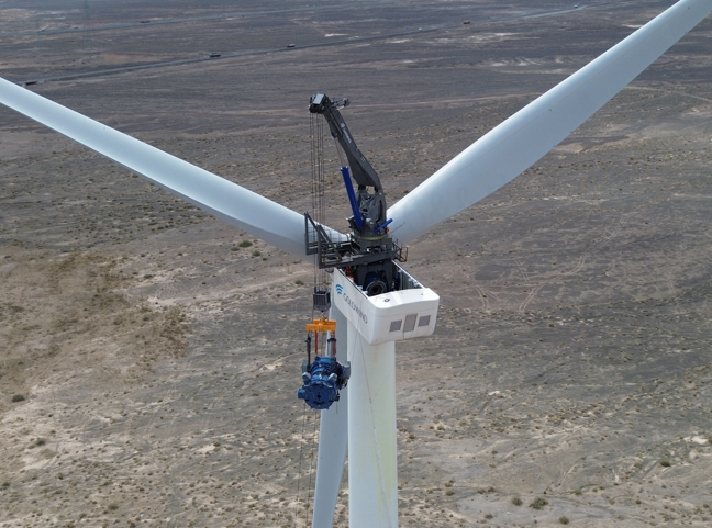 近日,金風科技在甘肅試驗風電場順利完成我國首個“風機大部件免主吊更換”智能設備測試,使用金風自主研發的“自提升智能設備”,完成了GWH204-6.7MW機組齒輪箱與發電機的高空拆裝驗證。依托該設備,未來風電機組大部件更換將大幅減少對大型吊裝設備的依賴,預計降低大部件更換運維成本達50%。