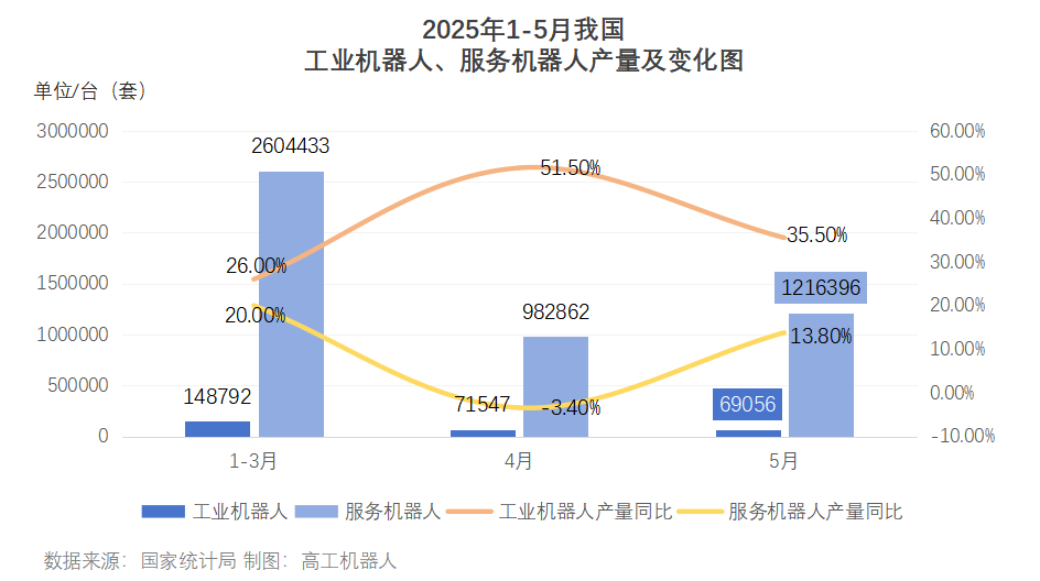 具體到機(jī)器人行業(yè)來(lái)看,5月份我國(guó)工業(yè)機(jī)器人產(chǎn)量69056套,較去年同期增長(zhǎng)35.5%;服務(wù)機(jī)器人產(chǎn)量為121.64萬(wàn)套,較去年同期增長(zhǎng)13.8%。