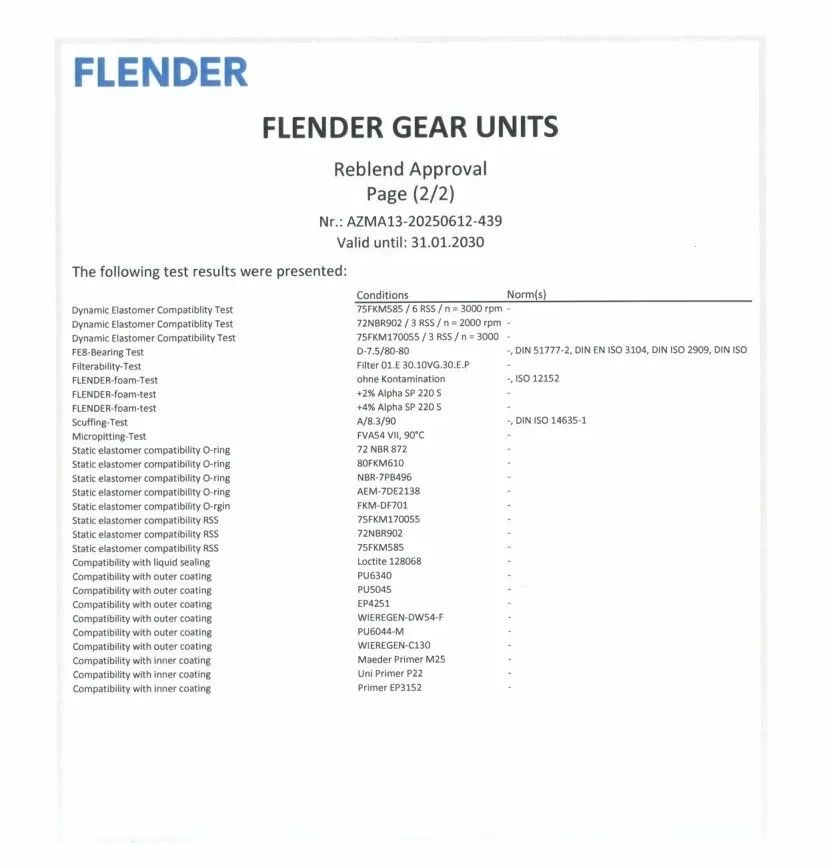 FLENDER弗蘭德作為全球機械傳動系統解決方案的領導者,是世界最早發電機組的專用齒輪箱生產企業,其齒輪箱廣泛應用于風電、礦山、水泥、冶金等極端苛刻的工業領域。其對配套潤滑油品的認證要求,被公認為行業內的“金標準”,審核流程極其嚴格。這包括在模擬甚至超越實際工況下進行的嚴苛性能測試(如極壓抗磨性、氧化安定性、抗乳化性等),要求產品在指定齒輪箱臺架或實際設備上經歷長時間、高負荷的運行驗證,并需具備完善且穩定的質量保證體系,確保從原材料到成品的全程可控與批次一致性。