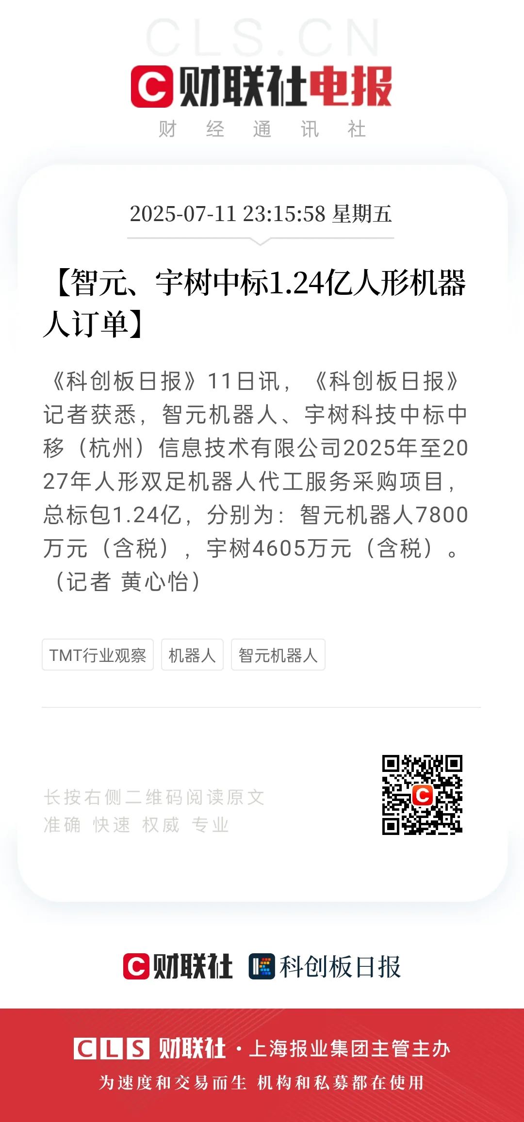 《科創板日報》記者獲悉,智元機器人、宇樹科技中標中移(杭州)信息技術有限公司2025年至2027年人形雙足機器人代工服務采購項目,總標包1.24億,分別為:智元7800萬(含稅),宇樹4605萬(含稅)。