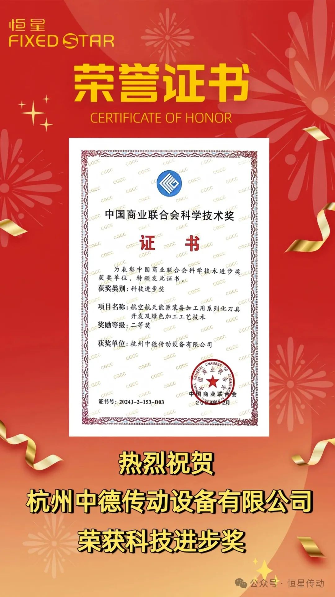 熱烈祝賀 杭州中德傳動設備有限公司 獲得科技進步獎