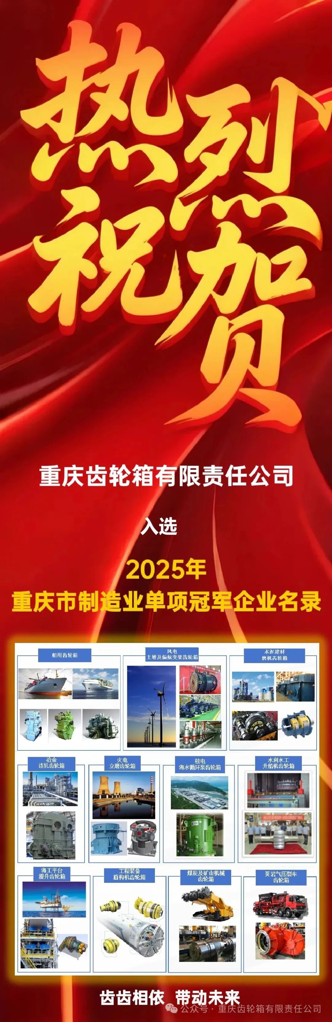 近日,重慶市經(jīng)濟(jì)信息委公布了2025年度重慶市制造業(yè)單項冠軍企業(yè)名錄,共30家企業(yè)入選,重慶齒輪箱有限責(zé)任公司作為一家有著近60年研發(fā)和制造高、低速重載齒輪箱為主的大型專業(yè)化企業(yè),名列其中!
