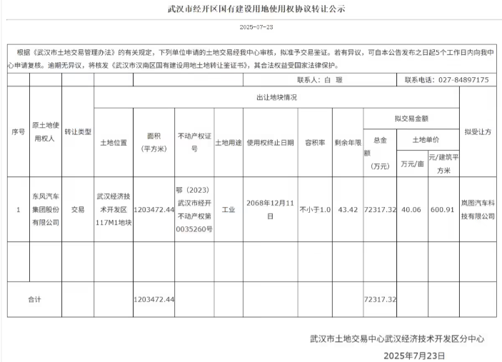 這座具備沖壓、焊裝等完整生產工藝的現代化工廠,位于武漢經濟技術開發區核心區域,土地面積超120萬平方米,原土地使用權人是東風汽車集團股份有限公司。