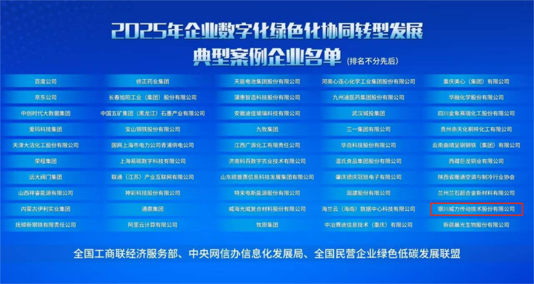 7月29日,全國工商聯、中央網信辦及民營企業綠色低碳發展聯盟聯合發布“2025年企業數字化綠色化協同轉型發展典型案例”,銀川威力傳動技術股份有限公司作為寧夏唯一入選企業,與百度、京東、阿里云等50家企業共同躋身國家級轉型標桿行列。