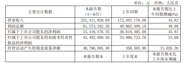 報告顯示,得益于核心產品市場需求的持續釋放以及生產運營效率的提升,該公司營收與利潤保持同步增長,實現營業收入2.51億元,較去年同期增長45.82%;歸屬于上市公司股東的凈利潤達5,341.64萬元,同比增幅達45.87%;扣非歸母凈利潤為4248.27萬元,同比增長25.09%。