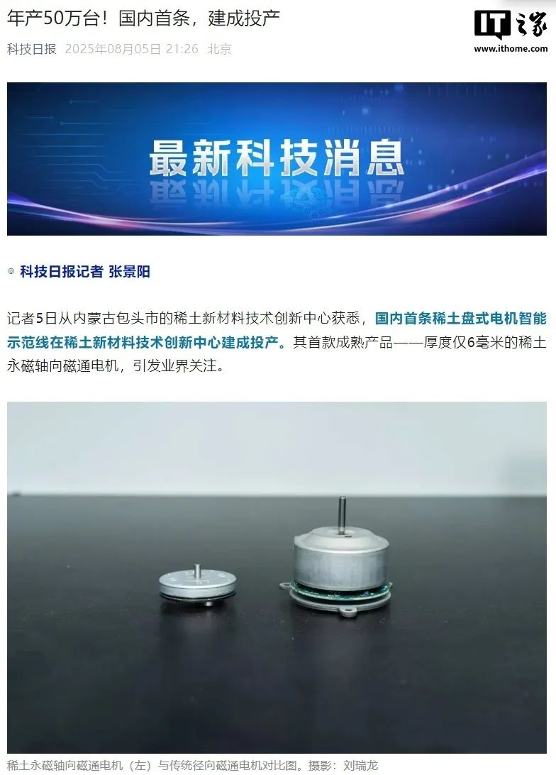 8月5日,位于內(nèi)蒙古包頭市的稀土新材料技術(shù)創(chuàng)新中心宣布,我國(guó)首條專門(mén)針對(duì)稀土盤(pán)式電機(jī)的智能示范線已正式建成并投入生產(chǎn)。該生產(chǎn)線首批推出的是一款厚度僅6毫米的稀土永磁軸向磁通電機(jī),其在體積、重量、能效等多項(xiàng)指標(biāo)上實(shí)現(xiàn)突破,被譽(yù)為“小身材、大能量”的代表性產(chǎn)品。