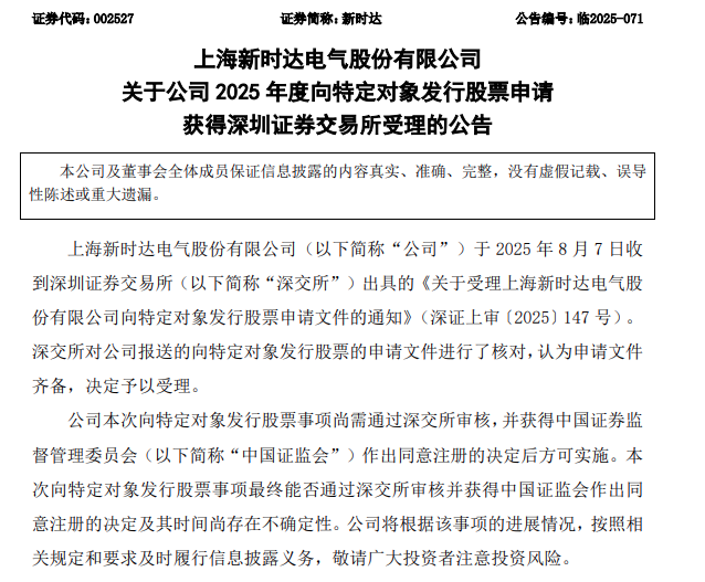 近日,上海新時(shí)達(dá)電氣股份有限公司(以下簡(jiǎn)稱(chēng)“新時(shí)達(dá)”)公告稱(chēng),2025年度向特定對(duì)象發(fā)行股票申請(qǐng)獲得深圳證券交易所受理。