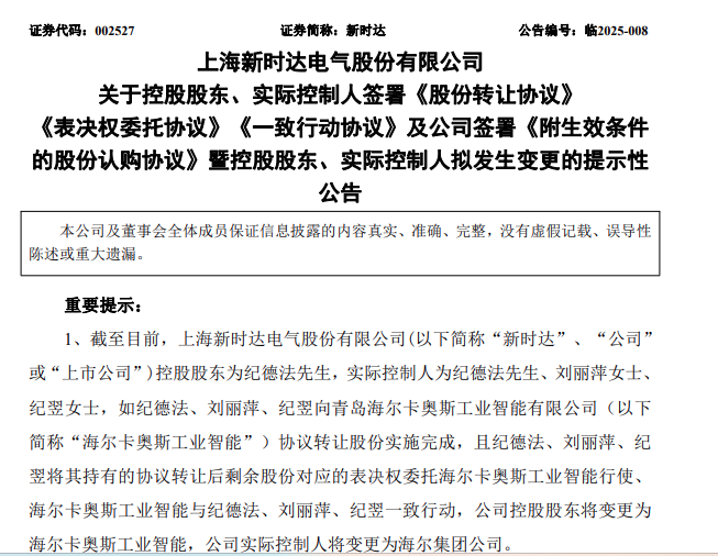具體而言,新時(shí)達(dá)三大股東紀(jì)德法、劉麗萍、紀(jì)翌與海爾卡奧斯工業(yè)智能簽署了一攬子協(xié)議。三人分別將其持有新時(shí)代的29,652,066股股份、27,685,828股股份和8,968,235股股份轉(zhuǎn)讓給海爾卡奧斯工業(yè)智能,同時(shí)將合計(jì)所持上市公司剩余127,583,569股股份的表決權(quán)委托給海爾卡奧斯工業(yè)智能行使,且三人與海爾卡奧斯工業(yè)智能為一致行動(dòng)關(guān)系。