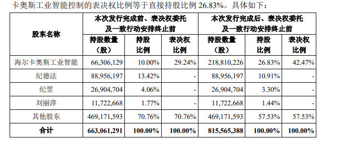 若定增順利通過(guò)深交所審核及證監(jiān)會(huì)注冊(cè),海爾卡奧斯工業(yè)智能直接持有新時(shí)達(dá)的股份數(shù)量將增至218,810,226股,占上市公司總股本的26.83%,表決權(quán)比例增加至42.47%,進(jìn)一步夯實(shí)控制權(quán)。
