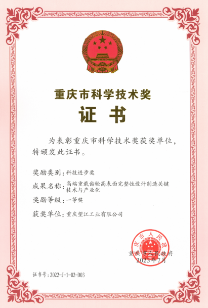 長安望江“高扭矩密度風(fēng)電傳動(dòng)技術(shù)重慶市工業(yè)和信息化重點(diǎn)實(shí)驗(yàn)室”自2021年獲批以來,在技術(shù)創(chuàng)新領(lǐng)域成果斐然,先后斬獲2021、2022、2024年重慶市科技進(jìn)步一等獎(jiǎng)。