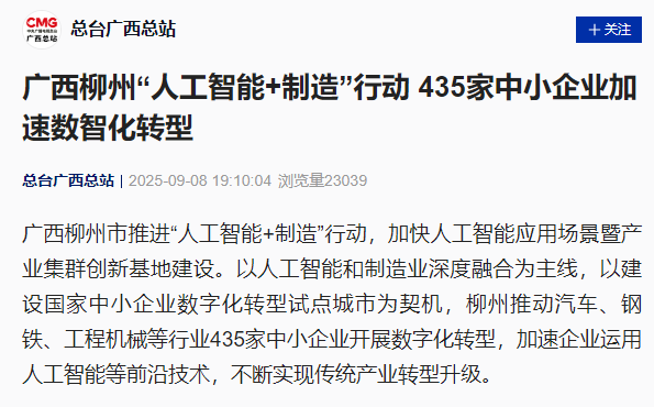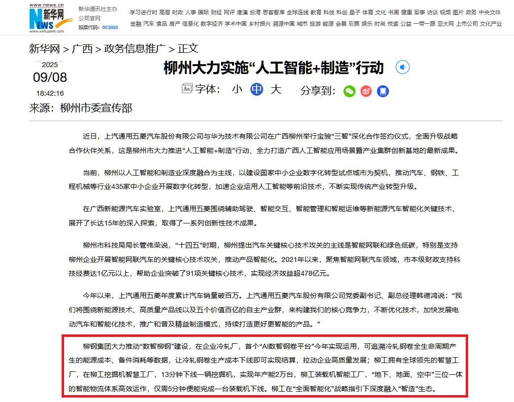 9月9日,《人民日?qǐng)?bào)》經(jīng)濟(jì)版刊發(fā)《廣西柳州加快發(fā)展新質(zhì)生產(chǎn)力 推動(dòng)企業(yè)從“制造”轉(zhuǎn)向“智造”》報(bào)道。文章指出,柳州以人工智能和制造業(yè)深度融合為主線,以建設(shè)國家中小企業(yè)數(shù)字化轉(zhuǎn)型試點(diǎn)城市為契機(jī),推動(dòng)企業(yè)開展數(shù)字化轉(zhuǎn)型,其中,柳工挖掘機(jī)智慧工廠,13分鐘下線一輛挖掘機(jī),實(shí)現(xiàn)年產(chǎn)2萬臺(tái)。
